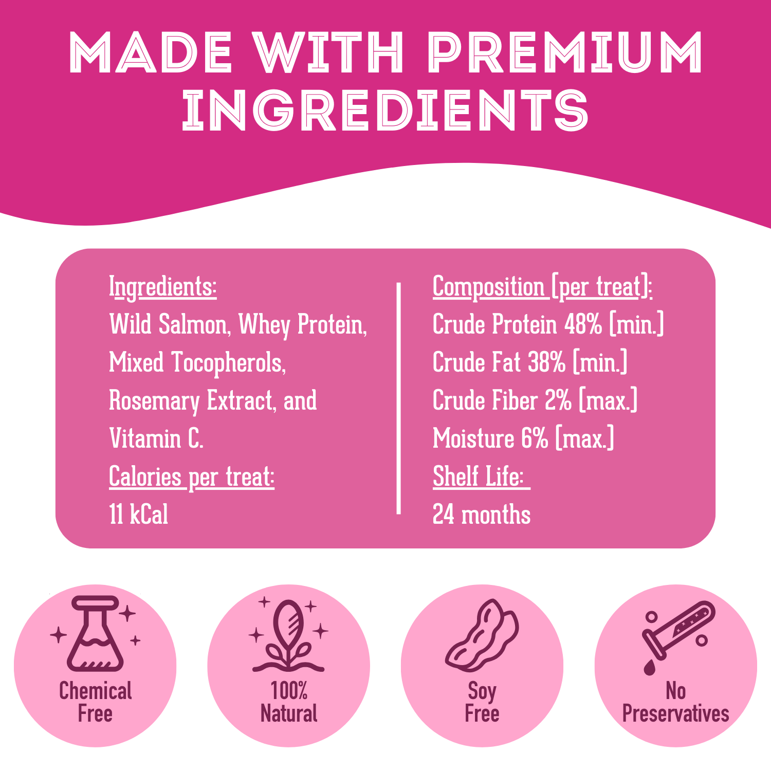 These delicious freeze dried salmon treats go through a low temperature freeze-drying process that locks in the flavors and nutrients. Dried while raw the taste is irresistible for both cats and dogs.